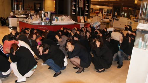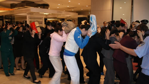國芳百貨員工按照防震緊急避險的標準動作進行演習