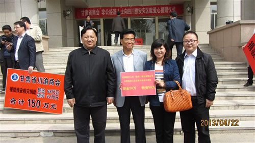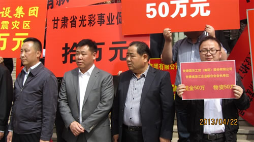 2013年4月22日下午15時,在甘肅省政協一樓,由甘肅省委常委、省委統戰部部長澤巴足,省委統戰部副部長、甘肅省工商聯黨組書記、第一副主席吳繼德等相關領導出席了“甘肅省商會非公經濟人士向四川雅安災區獻愛心捐贈儀式”。捐贈現場眾多甘肅省非公企業向4月20日雅安市地震災區進行了捐贈,廣大愛心企業和人士用自己的實際行動對災區同胞奉獻了自己的真情和祝福。