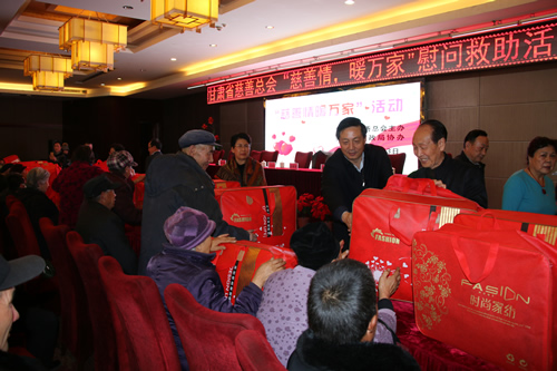 2016年12月12日,甘肅省慈善總會、武威市民政局攜甘肅國芳工貿(集團)股份有限公司共同舉行“情暖萬家”送溫暖活動,將100萬元資金以及價值100萬元的過冬棉服帶給天祝縣岔口驛敬老院的老人們。當日下午,甘肅省慈善總會與甘肅國芳工貿(集團)股份有限公司的各位愛心人士又馬不停蹄的趕赴張掖為當地的孤寡老人帶去了160萬元資金以及價值250余萬元的過冬衣物及被褥。此次活動傳導社會幫扶、精準扶貧精神的同時也默默為社會傳導著一份正能量。