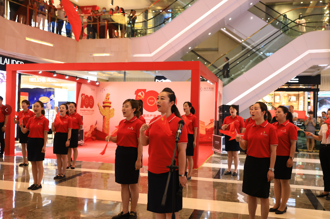 下午14時,國芳集團慶祝中國共產黨成立100周年紅歌快閃活動在蘭州國芳百貨廣場店一樓中廳隆重舉行。國芳集團全體黨員及員工代表參與其中,大家用歌聲表達對黨的無限忠誠和美好祝福。