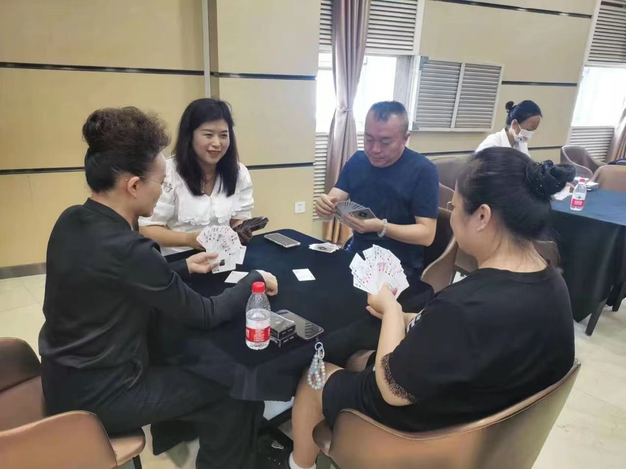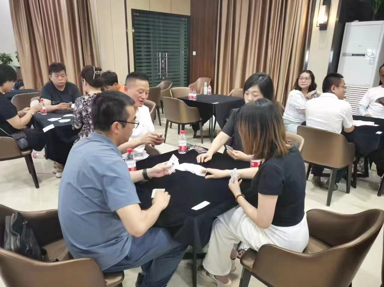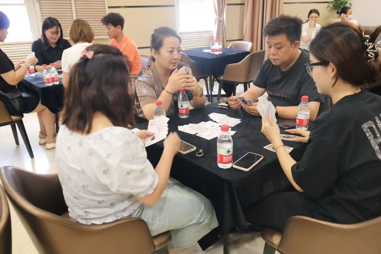在運動會的摜蛋比賽現場,氣氛熱烈而又緊張。一張張牌桌整齊排列,參賽選手們兩兩相對而坐,神情專注而投入。他們的目光緊緊鎖住手中的牌,大腦飛速運轉,思考著出牌策略。每一次出牌都顯得深思熟慮,又充滿了果斷和自信。